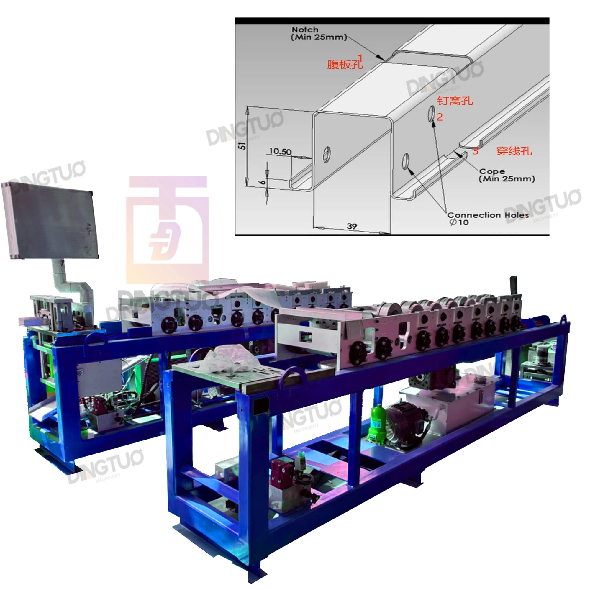 7 | Number of the punching groups | 5 sets of punching groups Model 1: web notch Model 2: Flange cut *2 dies Model 3: side hole Model 4: dimple hole Model 5: cut